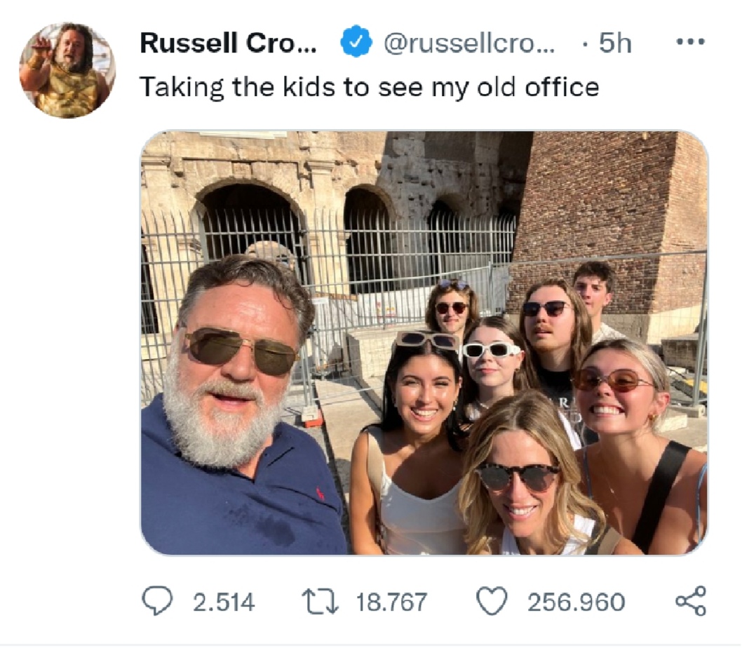L ‘attore neozelandese Russell Crowe, reso celebre a livello planetario dal film del 2000, “Il Gladiatore”, ha postato sui social un selfie a Roma, davanti al Colosseo, in compagna dei sui familiari.