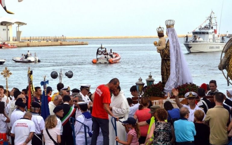 Nello specchio d’acqua davanti alla Basilica verrà gettata in mare la corona di fiori per ricordare i marinai vittime della guerra. La processione è molto sentita in città e in tanti partecipano sia da terra che dal mare, a conclusione del rito la statua verrà ricondotta all’interno della Basilica.
