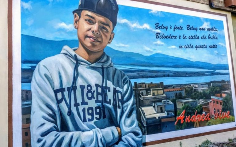 “Belvy è forte, Belvy non molla, Belvedere è la stella che brilla in cielo questa notte”. I versi di una delle sue canzoni da una parte, dall’altra Andrea, con le braccia conserte e gli occhi pieni di vita. Quella interrotta lungo la via Nenni, il 23 luglio scorso, in una tarda mattinata di un martedì apparentemente uguale a ogni altro. Andrea vive, si legge nel maxi murale realizzato da Davide “Pils” grazie a una raccolta fondi voluta dai suoi amici e benedetto dal nostro parroco Don Ireneo. Un modo per ricordare Andrea e i suoi occhi buoni che da questa sera chiunque si ritroverà davanti passeggiando nel Parco Lineare.
