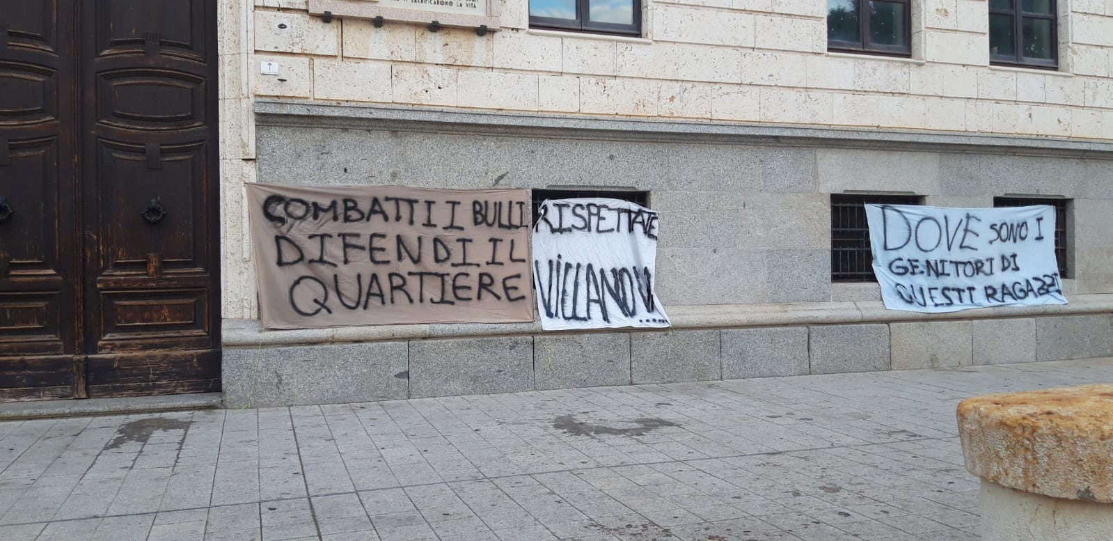 In piazza sono comparsi degli striscioni di protesta che invocano l’intervento dei genitori di questi ragazzini ma anche delle forze dell’ordine.