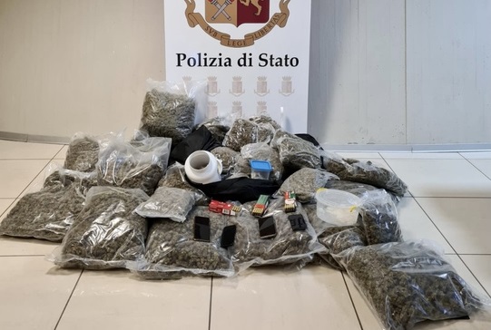 All’interno sono stati rinvenuti 41 Kg di marijuana, 1,6 kg. di cocaina e 264 gr di hashish. Durante la perquisizione sono state trovate anche 175 cartucce per pistola.