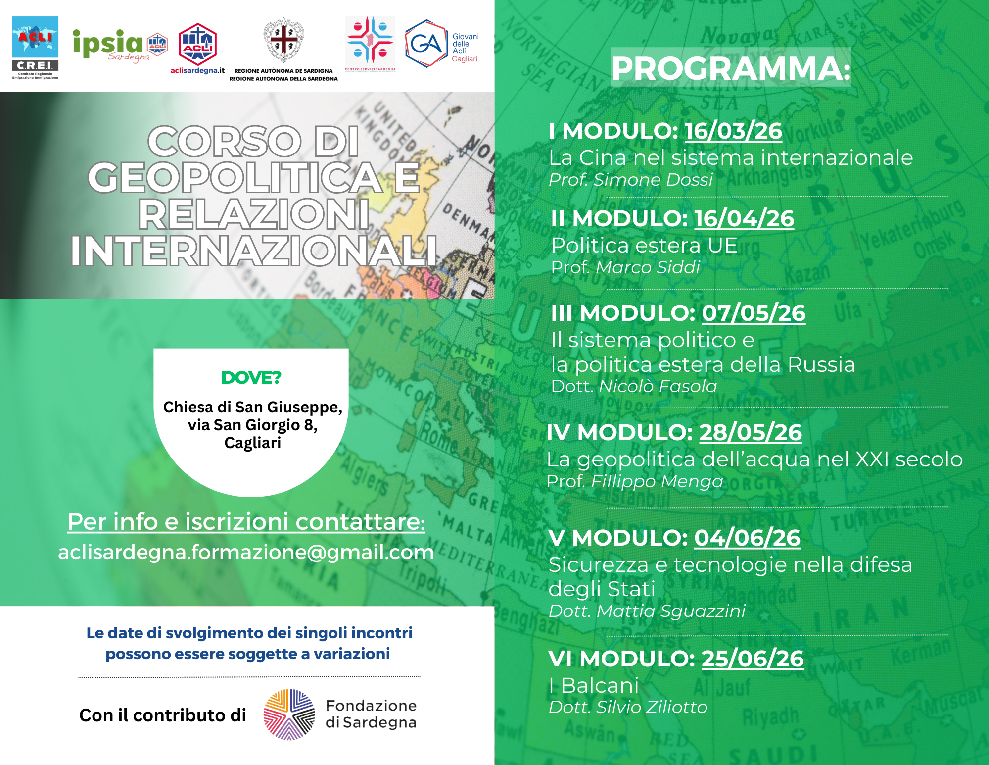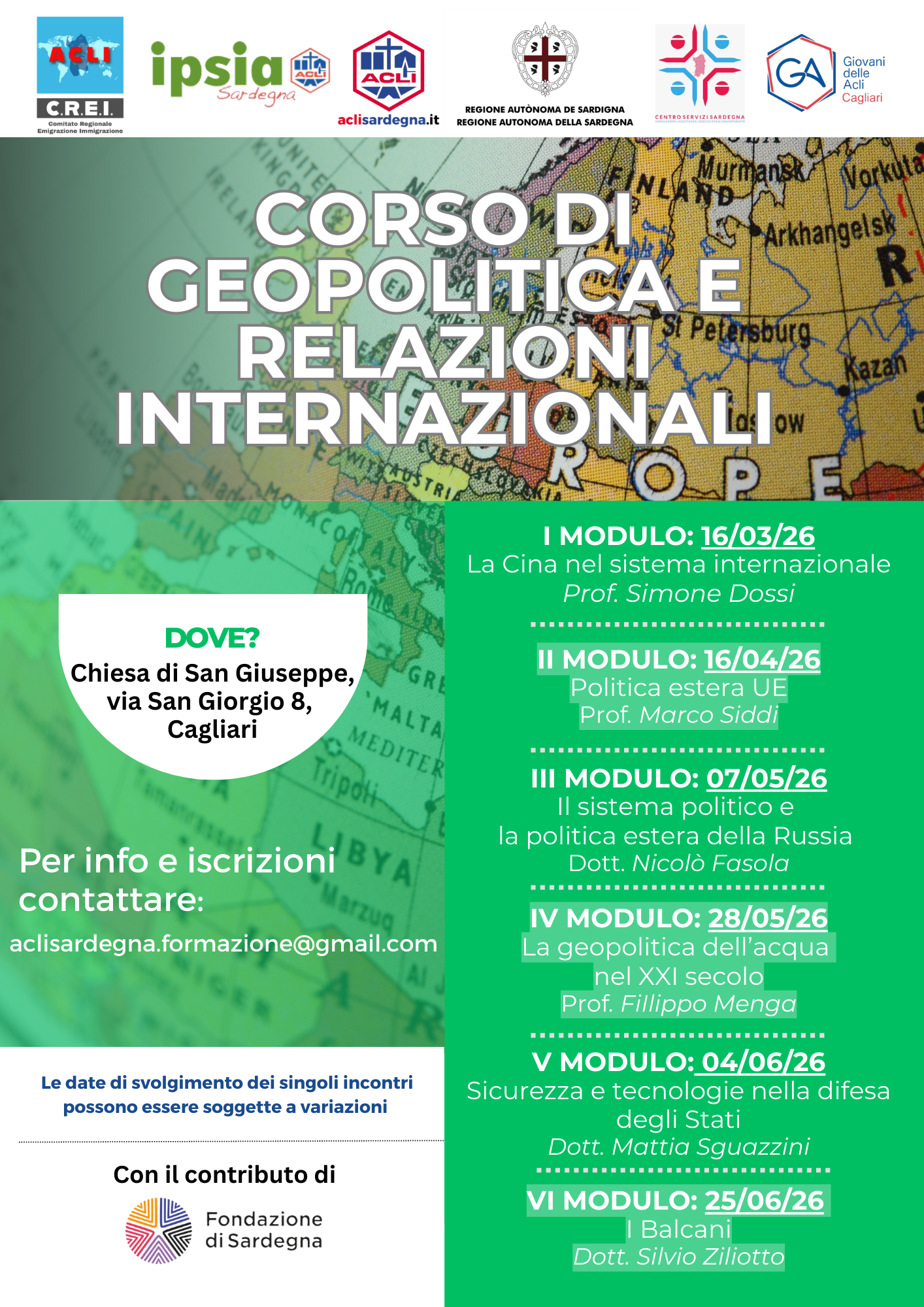 Le Acli della Sardegna, in collaborazione con CREI, IPSIA e i Giovani delle Acli proseguendo l’attività formativa intrapresa, confermano anche per il 2026 l’organizzazione di un “Corso di geopolitica e relazioni internazionali”.
