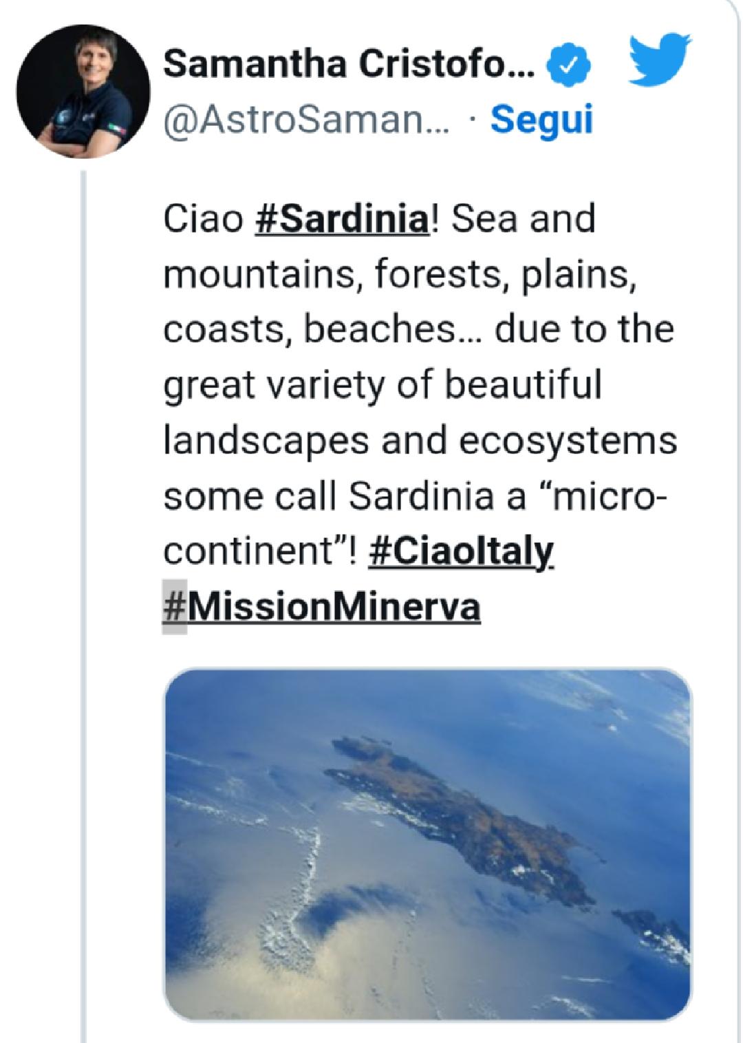 Cristoforetti, in uno di questi ha immortalato una suggestiva immagine dell’intera Sardegna scrivendo: “Ciao Sardegna! Mare e montagne, foreste, pianure, coste e spiagge… per la grande varietà dei suoi bellissimi paesaggi ed ecosistemi c’è chi considera la Sardegna un ‘micro-continente’ “.