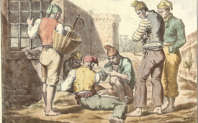 Nell’ottobre del 1759, ancora un bambino, a soli otto anni, Ferdinando era diventato re ereditando dal padre il trono napoletano. Questo sovrano viene ricordato da tutti con il curioso appellativo di “Re Lazzarone”. Perché gli venne attribuito questo appellativo? Soprattutto per la natura bizzarra del suo carattere, che acquisì, con il passare degli anni, tratti sempre più rustici e plebei. Pare, infatti, che il monarca si divertisse molto ad avventurarsi nei quartieri popolari di Napoli travestito da straccione per non farsi riconoscere dai suoi sudditi. Durante queste sue incursioni notturne in città era solito prendere in giro le persone che incontrava rivolgendo loro, il più delle volte, sonore e provocatorie pernacchie. Si racconta che una notte il re cominciò a sfottere un soldato di guardia; la sentinella, fortemente risentita, gli puntò contro il fucile. Un nobile che accompagnava Ferdinando avvertì allora la guardia di abbassare subito l’arma poiché colui che gli stava di fronte era il suo sovrano. La risposta del soldato a quel punto fu schietta e lapidaria: “I re non fanno simili porcherie!”.