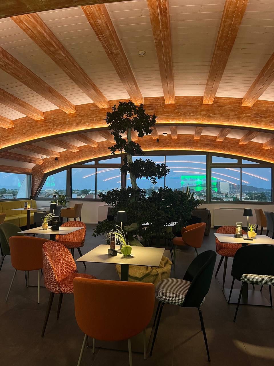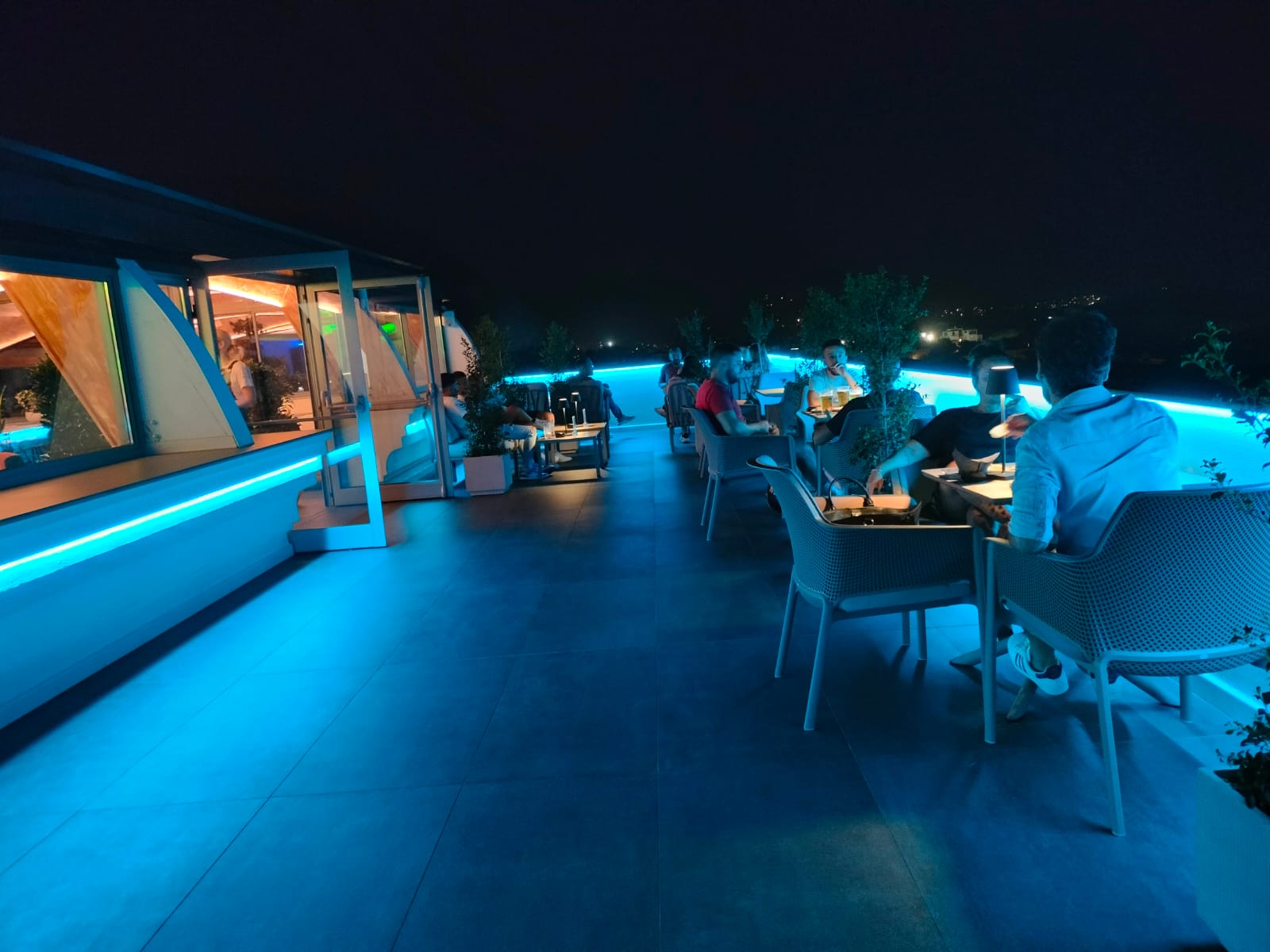 Appena arriviamo a destinazione, ci rendiamo conto che i nostri amici avevano proprio ragione: il locale è una vera e propria terrazza panoramica. Il primo istinto è dirigersi verso le vetrate, guardare giù: si vede tutta Tortolì dall’alto ma i nostri occhi vanno oltre, verso il mare. Meno male che manca ancora mezz’ora al buio totale, perché questo panorama, già illuminato ma ancora chiaro, è davvero sublime.
