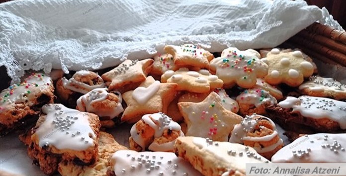 Per l’impasto: 500 g di farina 00, 150 g di zucchero, 150 g di burro (o strutto), 200 g di uva passa, 100 g di mandorle tritate (o noci), 100 g di gherigli di noci, 1 bustina di lievito per dolci, scorza grattugiata di 1 limone, scorza grattugiata di 1 arancia, 2 uova, 1 cucchiaio di semi di anice (facoltativo), 1 bicchierino di acquavite o liquore all’anice, latte q.b. (se necessario per impastare)