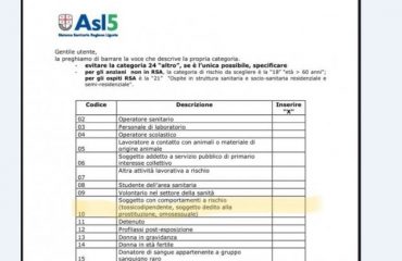 Un documento in cui, oltre ai dati anagrafici del richiedente, vengono elencate trenta categorie di soggetti tra le quali dichiararsi. Dalle donne in gravidanza agli studenti in ambito sanitario, fino ai lavoratori delle forze dell’ordine. Fino, al punto 10, ai soggetti con “comportamenti a rischio”: tossicodipendenti, soggetti dediti alla prostituzione, omosessuali. “Un chiaro errore, lo riconosciamo, per cui possiamo solo scusarci, – ammette dall’Asl il direttore dell’azienda sanitaria Paolo Cavagnaro – ma stiamo anche tentando di spiegarci”, si legge su Repubblica.